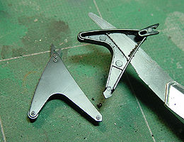 キット付属のレーシングスタンドは本物とずいぶん違う。本来カーボン製のパネル二枚を合わせた形状だが、キットは簡略化しすぎ。コストとの兼ね合いもあるのだろうが、これは非常に残念。