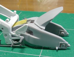 まずはリヤのスイングアーム周り。ケンジローさん作のパーツを使用する。このパーツは以前04キャメル玉田号を作ったときにも使ったのだが、細かいところまでバッチリ再現されていてとても良くできている。