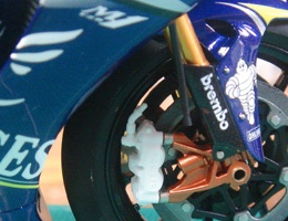 その後・・・・・タミヤから「06 RC211Vレプソル」のキットが新発売。その中に新型のbremboブレーキキャリパーが入っている。この新型キャリパーは05年から使用されているのでこの05M1に使ってみた。ピッタリ合うので無加工で流用できそう。