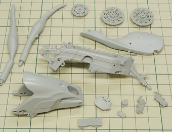レジンパーツに複製して組んでみる。ホイールは各チームやレースごとに数種のホイールが使われている。写真の渦巻き型マルケ、別の形状のマルケ、そしてアプリリア製(?)のカーボンホイールの3種類。
