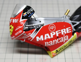2008年シーズン大ブレイクし、バウティスタとのチャンピオン争いを制したボンバーヘアが特徴のマルコ・シモンチェリ。シーズン開始時、チームメイトのロカテリはワークス仕様の新型RSAでシーズンをスタートしたが、シモンチェリに供給されたのはサテライト仕様のRSW(LE)だった。ところがその後の活躍で、シーズン途中からシモンチェリにもワークス仕様のRSAが供給された。今回はこの新型ワークス仕様のRSAを製作する。