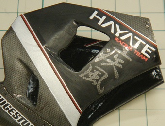 右の写真は研ぎ出し後。カーボン地が抜けた状態になる。なかなかリアル(嬉)*ラグナセカとザクセンリンクの2レースではではサイドカウルのラインが変更され、「疾風」の文字もただのグレーになっていたようだが、その後のイギリスでは元に戻っていた。