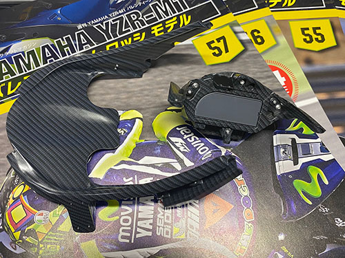 デジタルメーターや導風板などカーボンパーツ部分が続く。