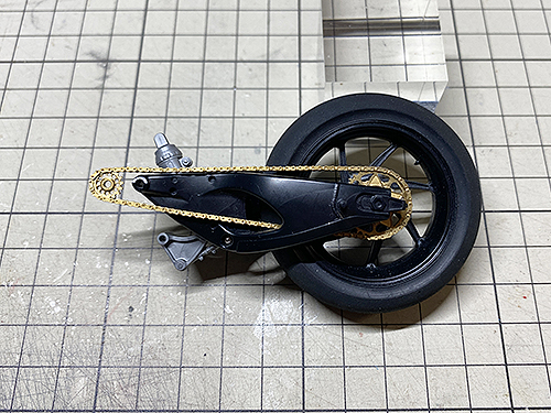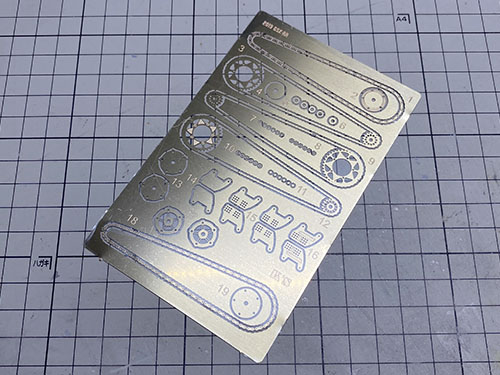 ステップホルダーやリヤのスプロケ周りも形状が違うので、この部分はエッチングパーツで再現する。
