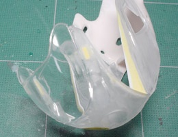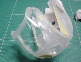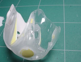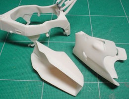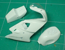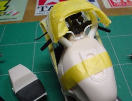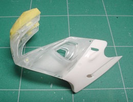 トランスキットにはバキュームパーツのスクリーンが付属しているが、タミヤキットのスクリーンをそのまま使うことにする。このパーツ、ベースキットがストリート用車種のFZR750であるために、スクリーンの縁にはゴムのモールドが再現されている。