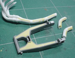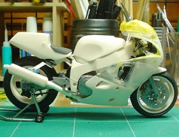 アンダーカウルのレジンパーツはプラパーツと接着してツライチになるように加工。ミラーやウィンカーの穴もパテで埋めた。