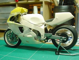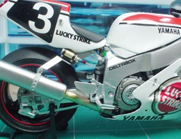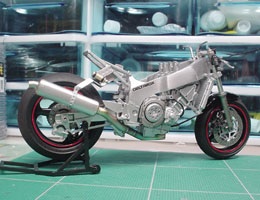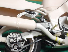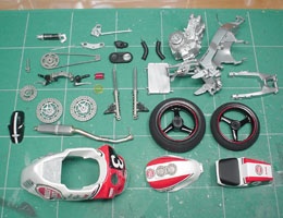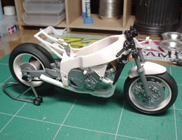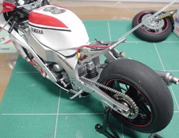 フレームにエンジンを乗せ、リヤ周りも組み上げる。やっぱGPマシーンと違って横方向が大きいな〜。