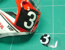 バキュームパーツのライトカバーにゼッケンデカールを貼り、虫ピンでカウルに固定する。