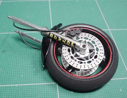 まずはフロント周りから。最近のレーシングマシーンはカーボンディスクだから必要ないのだが、この当時のマシーンのフロントブレーキディスクは鋳鉄(?)製で冷却用の穴が空いている。ディスクの穴空けが面倒。