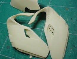自作した96YZR500トランスキットを使って97年バージョンのYZR500を作ることにした。96と97の外見上の変更点はほとんどなく、細部の改造のみで作れそうだ。レジンパーツを洗浄後、塞がっているダクトを開口。