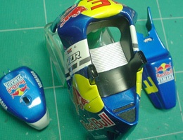 お次はデカール作り。1997年のヤマハワークスチームは96年まで長きに渡ってスポンサードされていたマルボロ(フィリップモリス)と別れ、スポンサー無しのヤマハワークスカラーで参戦。寸法や形状を確かめるため、何度か試し貼りしてみる。