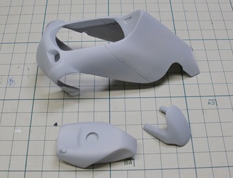 ホワイトで塗装。このカウルは平面の部分が多く、下地で手を抜くと塗装後にアラが目立ちそうなので、いつもより更に下地作りに気を使った。